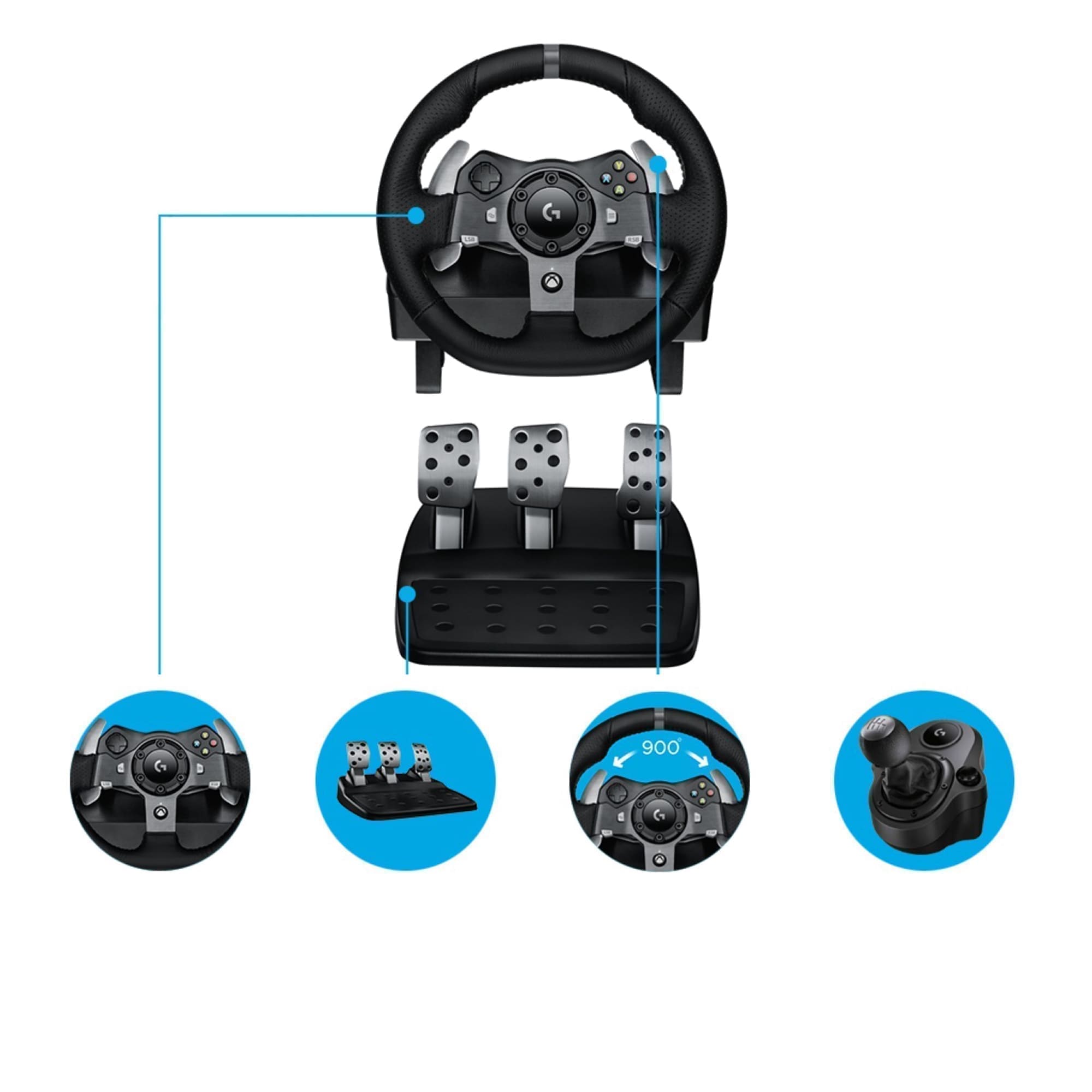 G920 Driving Force is the definitive sim racing wheel for the latest Xbox Series X|S, Xbox Oneâ„¢ and PC titles. With realistic dual-motor force feedback and helical gearing for quiet, smooth steering. On-wheel controls and paddle shifters are easy to access so you can make crisp, precise gear transitions. The separate pedal unit gives you natural, responsive control, with a nonlinear brake pedal that mimics the feel of high-performance vehicles. Driving Force is built for comfort and durability with hand-stitched leather and stainless steel components. Built-in clamps and bolt points keeps Driving Force mounted securely to a table or racing rig, minimizing shifting or wobbling during aggressive maneuvers.