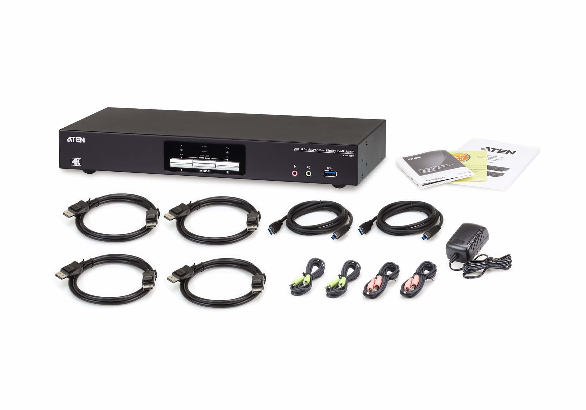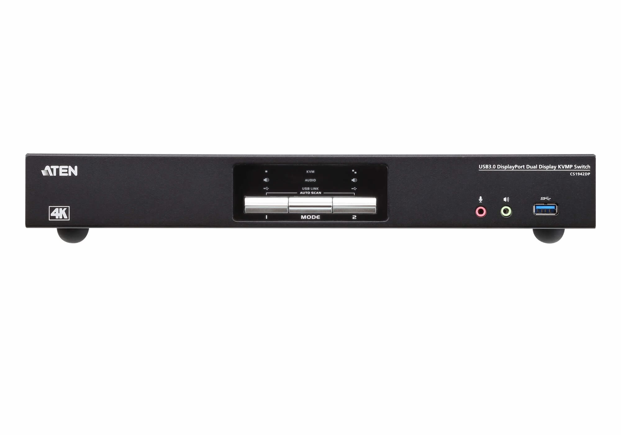 The ATEN CS1942DP desktop KVM switch helps organize your desktop. Especially when managing a multimedia workstation at a large organization, CS1942DP provides you with instant access to two or four computers, all through a single USB keyboard, USB mouse and two DisplayPort monitors.