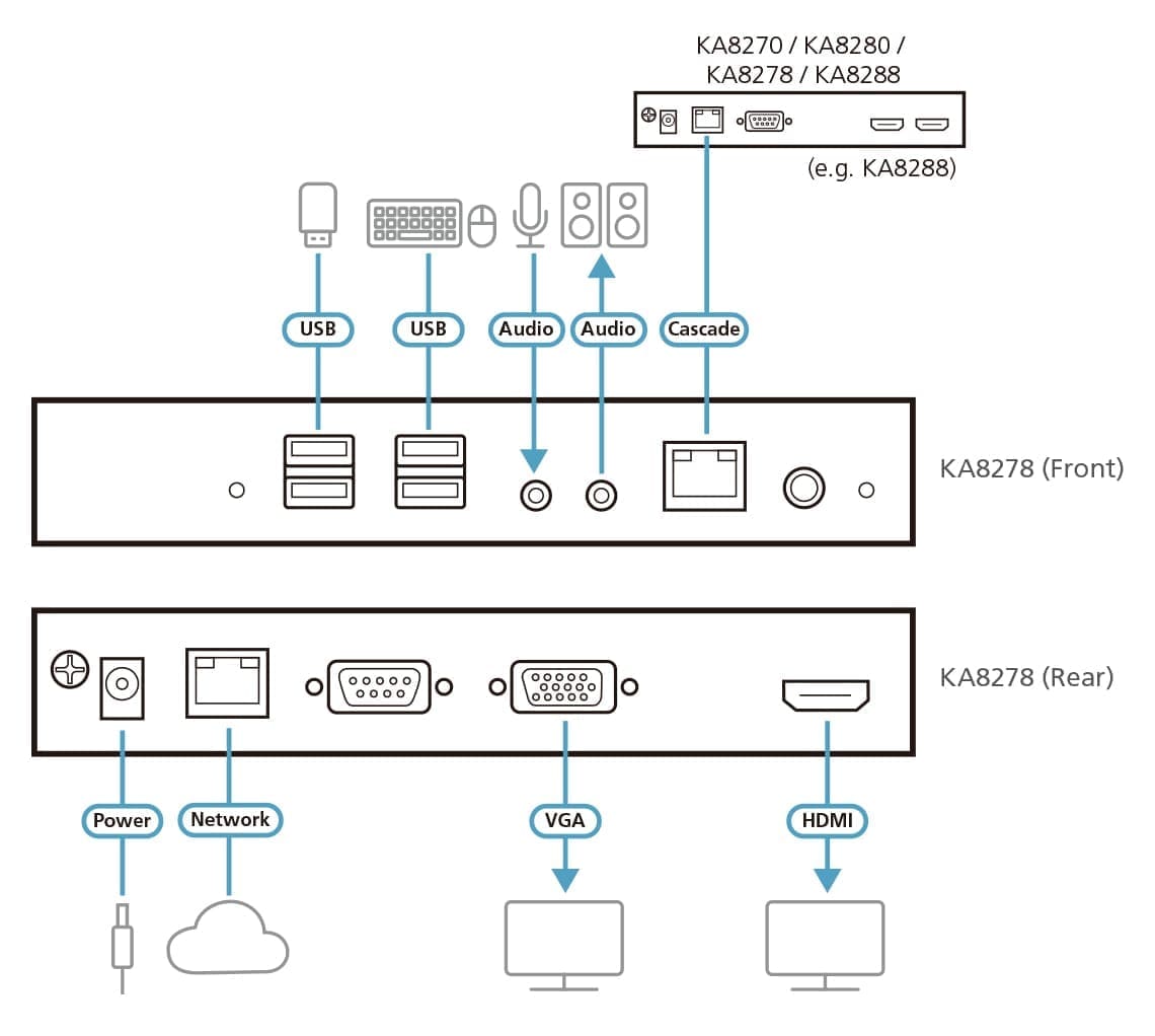 The KA8278 supports USB mouse/keyboard and two USB ports for Virtual Media function, and supports 1 VGA plus 1 HDMI video outputs at resolutions up to 1920 x 1200 @ 60 Hz. The KA8278 also enables users to multitask across two displays with a single keyboard and mouse.