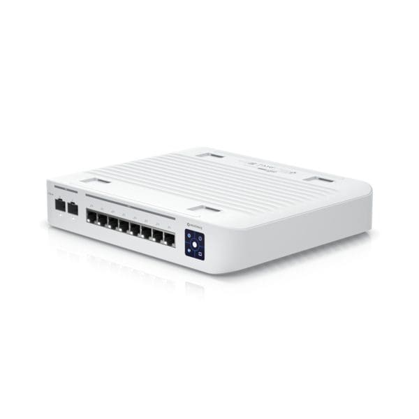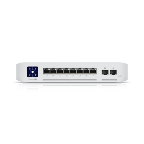 The Switch Enterprise 8 PoE (USW Enterprise 8 PoE) is a fully managed, Layer 3* switch with (8) 2.5GbE, 802.3at PoE+ RJ45 ports and (2) 10G SFP+ ports.The USW Enterprise 8 PoE also features a 1.3″ LCM color touchscreen that concisely displays key system and connection insights. This switch can be monitored or configured from anywhere with the powerful, intuitive UniFi Network web application and mobile app.
