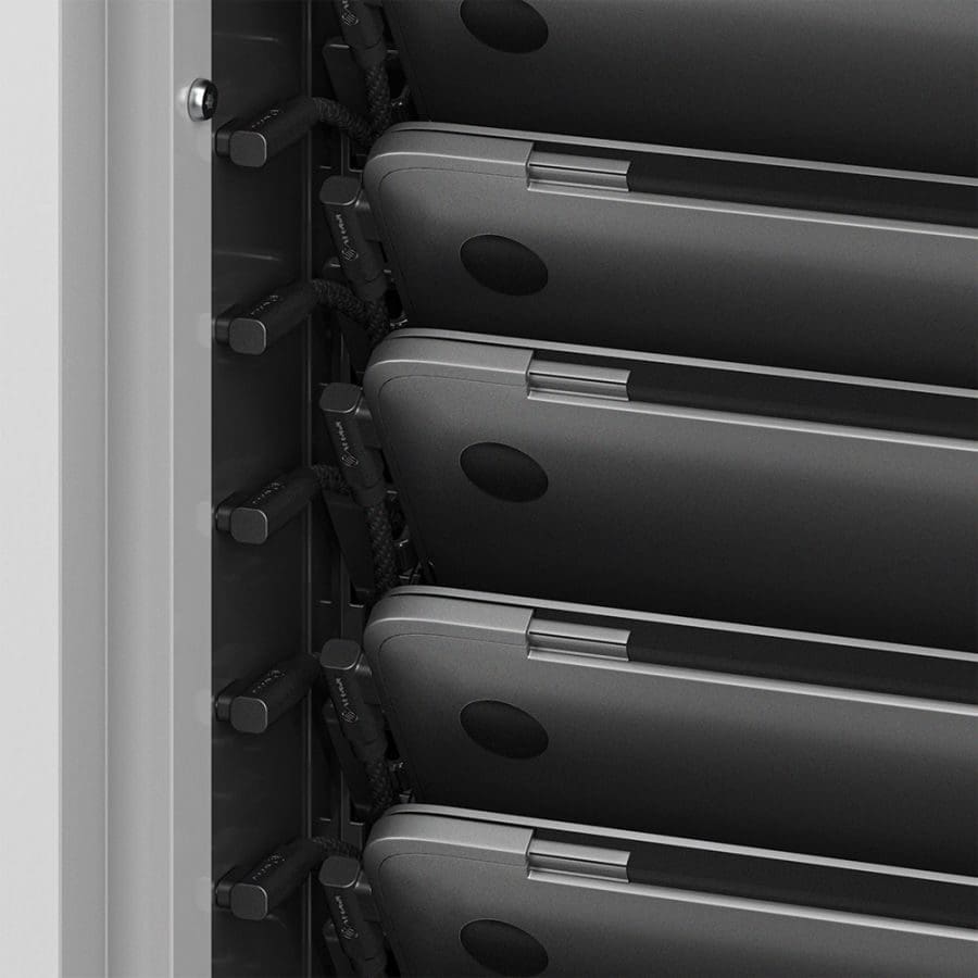 The Smartbox’s USB-C bays tilt to significantly reduce the depth of space the cabinet consumes. The USB-C cable sit connects to are cost-effective alternatives to power adapters. The Smartbox also features optional cable management support on the inside of the cabinet, and daisy-chaining connectivity.