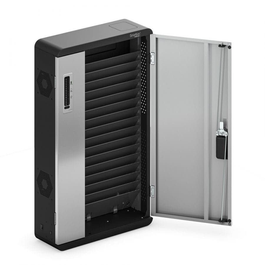 The Smartbox Power Wall 15-Bay Charging Wall Cabinet is a USB-C wall cabinet that securely stores and charges up to 15 devices [sized up to 13”], including tablets, notebooks and Chromebooks. The lockable lightweight container’s slim profile occupies a fraction of the room space of bulkier cabinets, delivering a smart and better solution.
