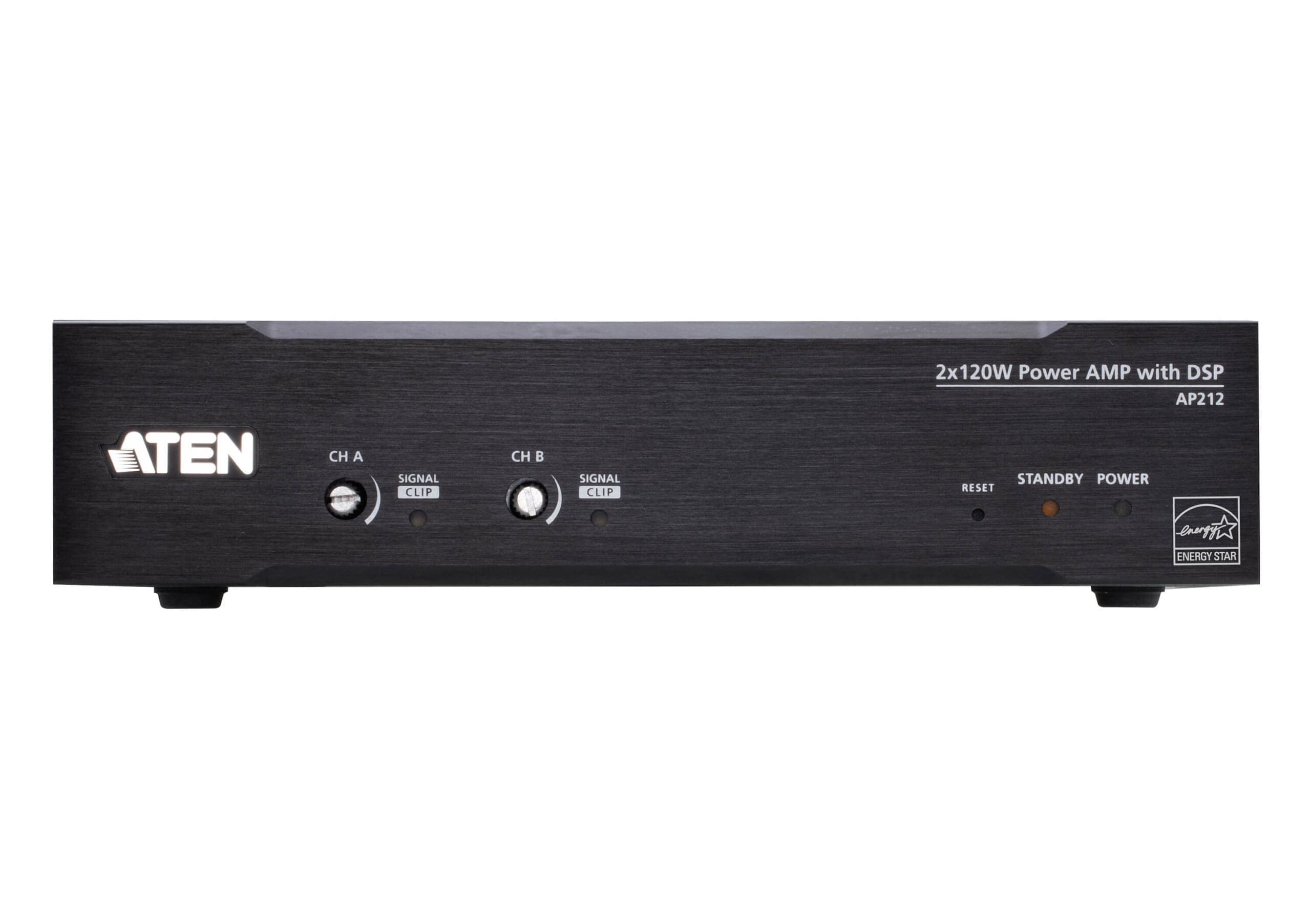 ATEN AP212 is a dual-channel DSP-equipped amplifier that delivers 120 W per channel in a compact enclosure. The support for balanced / unbalanced line level inputs and the capability of driving 4 ohm low impedance or 70/100V line (in Bridge mode) loudspeaker systems have made AP212 suit a wide range of public address applications. Configurable through an intuitive WebGUI, the built-in DSP allows Speaker EQ, 5-band EQ, delay, limiter, and up to 20 presets for precise tuning and extensive audio system protection purposes. Ground lift is deployed to eliminate unwanted hum noises from power circuit. Immersive sound experience is delivered with no compromise on power efficiency thanks to the amplifier’s Class-D design and ENERGY STAR qualification, conserving energy while lowering operational costs. Customizable Auto Standby mode enables the AP212 to automatically switch to “sleep” when the signal level comes lower than -40 / -50 dBu for 10 / 15 / 25 minutes.