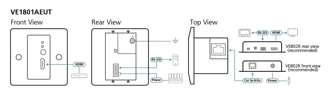 The VE1801AEUT can be easily mounted in a 1-gang junction box with EU wall plate, concealing bulky cable setups and presenting needed information in sight. In addition, with built-in PoH (Power over HDBaseT) function, the VE1801AEUT receives power supply from a connected PoH PSE supported receiver and streamlines complex power line deployment.