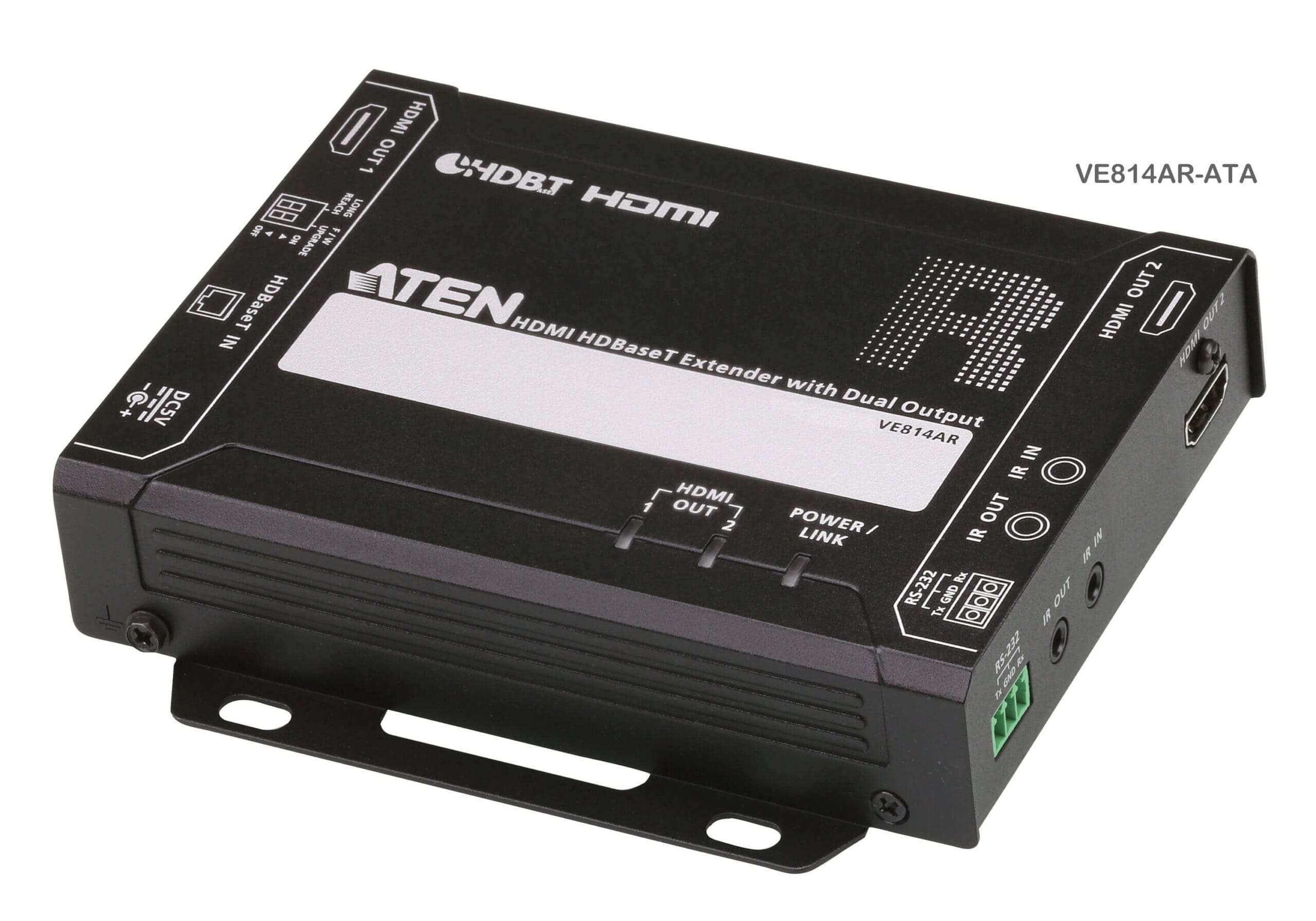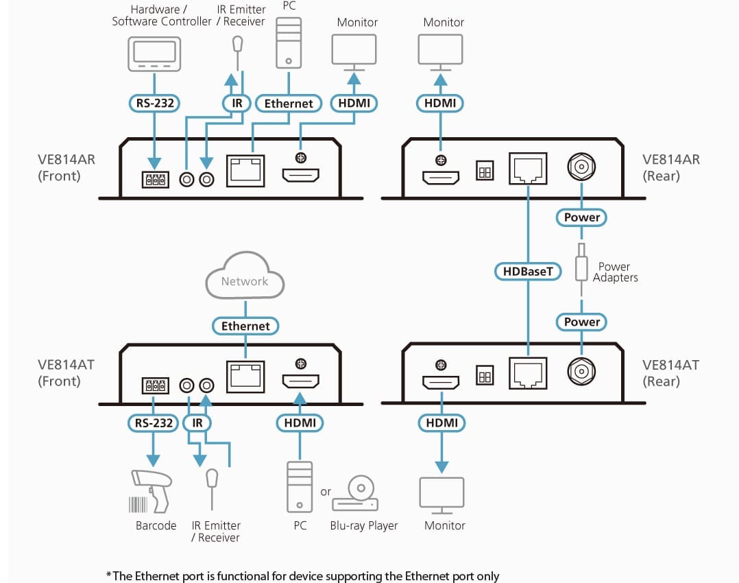 The VE814AR supports RS-232 and IR signaling pass-through, allowing you to control the HDMI source device from the remote unit (VE814AR) while granting access to the HDMI display device from the local unit (VE814AT). In addition, it supports Long Reach Mode that extends HDMI signals up to 150 m, 1080p, via a single Cat 5e/6 cable.