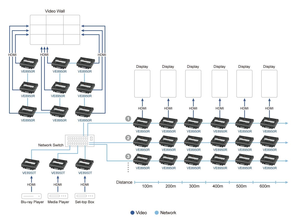 Engineered to meet today’s demands of large scale, multi-display, 1080p signal transmission, and designed to be easy to set up and operate, the VE8900T Video over IP Transmitter is an ideal product for a wide range of environments, such as trade shows, airports, university campuses, conference centers, and shopping centers.