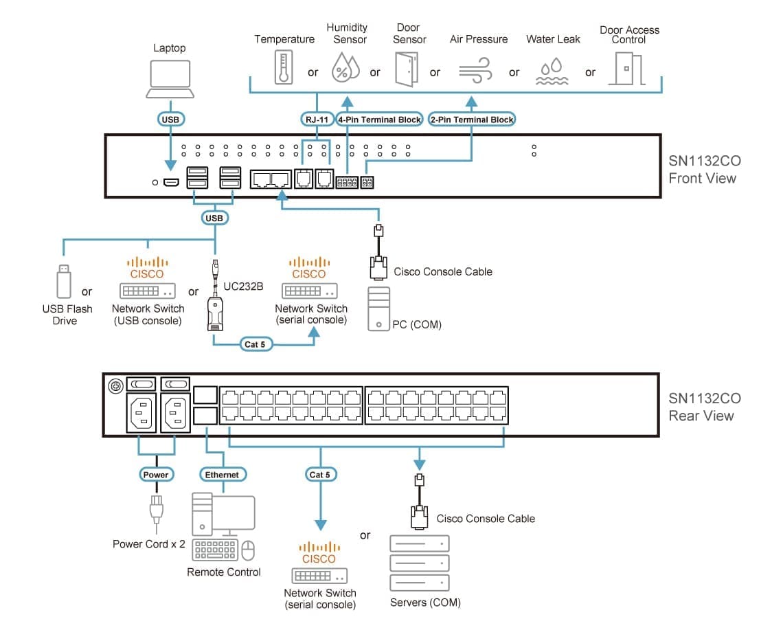 All series of serial console server features Cisco pin-outs and auto-sensing DTE / DCE function, providing a direct connection to Cisco network switches (and other compatible devices) without rollover cables for more time-saving IT infrastructure deployment. In addition, it support online detection of connected serial devices (including terminal blocks) for device status monitoring. An e-mail notification will be sent to the administrator when connected devices are offline. With dual Ethernet ports and power supplies (AC), the SN11xxCO supports power redundancy as well as failover, or dual IP addresses access, ensuring 24 / 7 availability of access to serial devices. A DC power option is also available for each of the SN11xxCO model for more flexible implementation2.