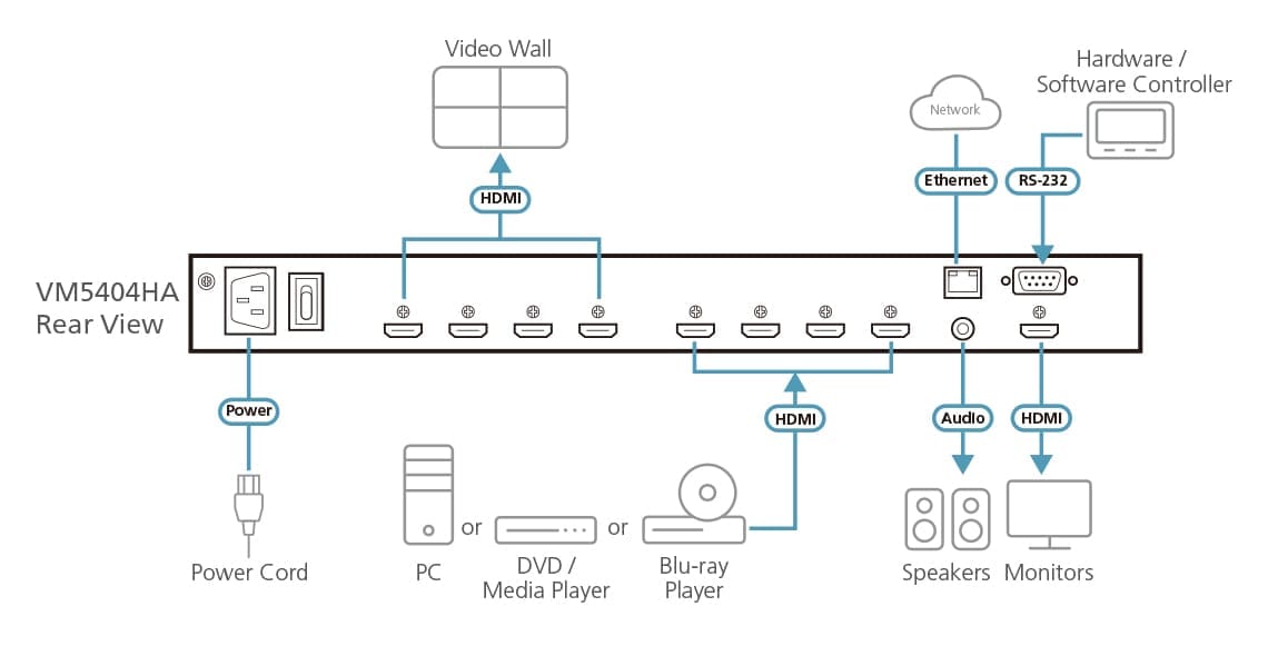 Speaking of audio functionality, the Matrix Switch features audio de-embedding, enabling digital audio from any HDMI input to be assigned to the stereo output for added flexibility of installation. The VM5404HA is an HDMI video routing solution ideal for scenarios where customizable, real-time AV signal transportation from multiple sources to one or more destinations is required, from control centers, server rooms, to any kind of video wall applications.